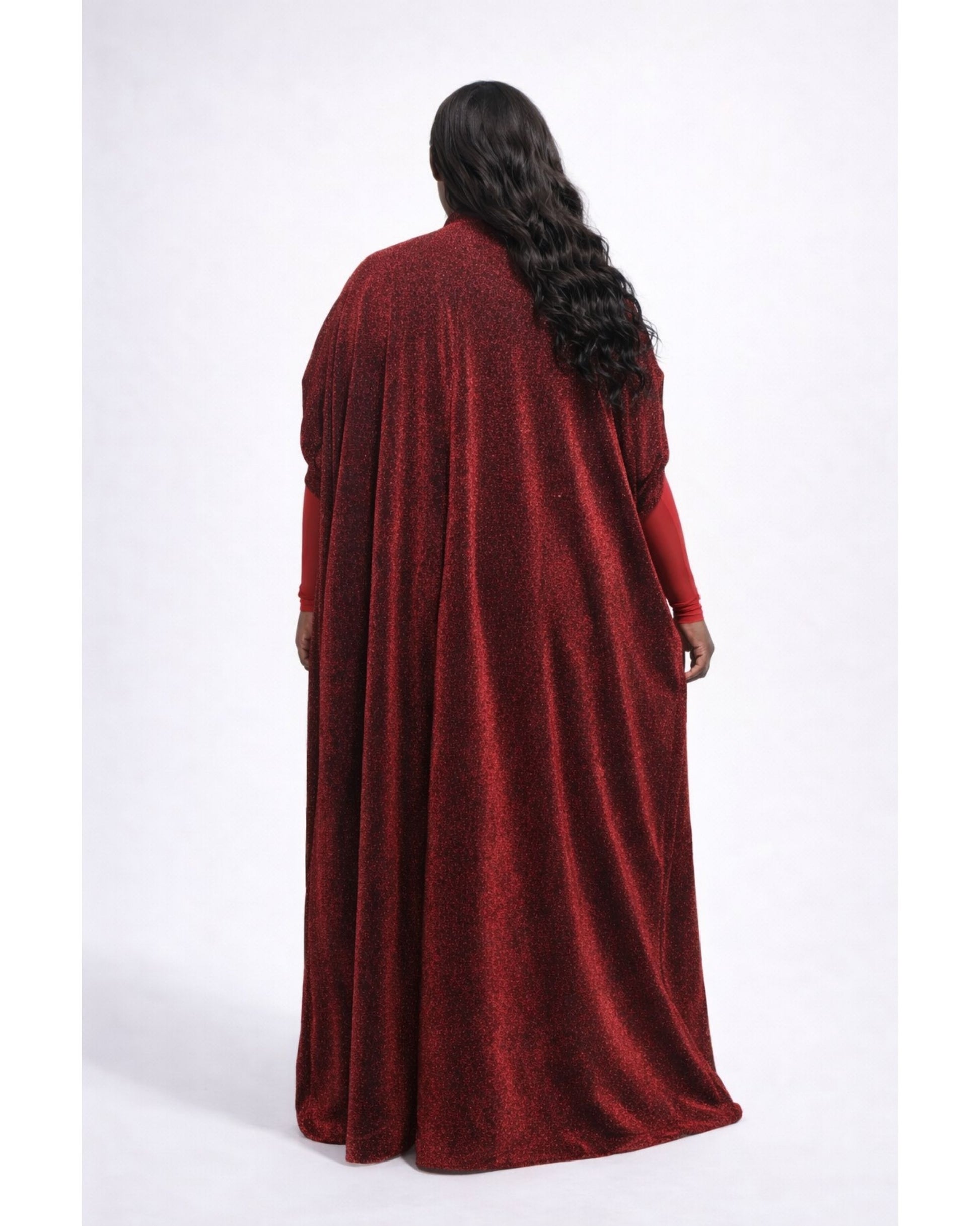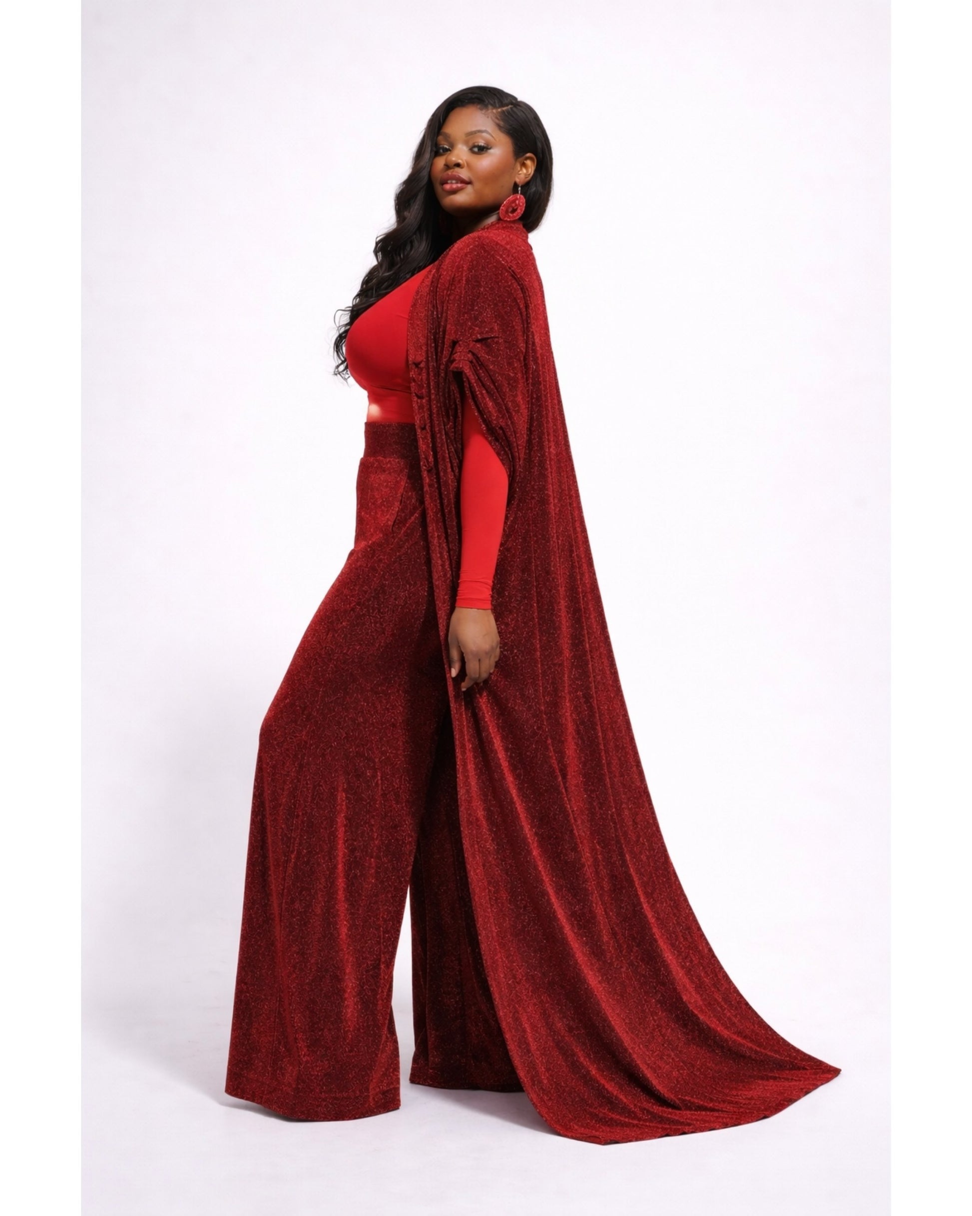 This set is a perfect vacation look. Made with lightweight knit fabric, it is perfect for those hot tropical vacation destinations. Crafted in a rich, shimmering red fabric, the set catches the light with every movement, creating a striking yet refined statement. The high waisted silhouette elongates the legs, while the relaxed wide-leg cut offers both comfort and sophistication. The lightweight duster adds graceful movement and versatile styling — wear it open for fluid elegance or draped for a more elevated look.