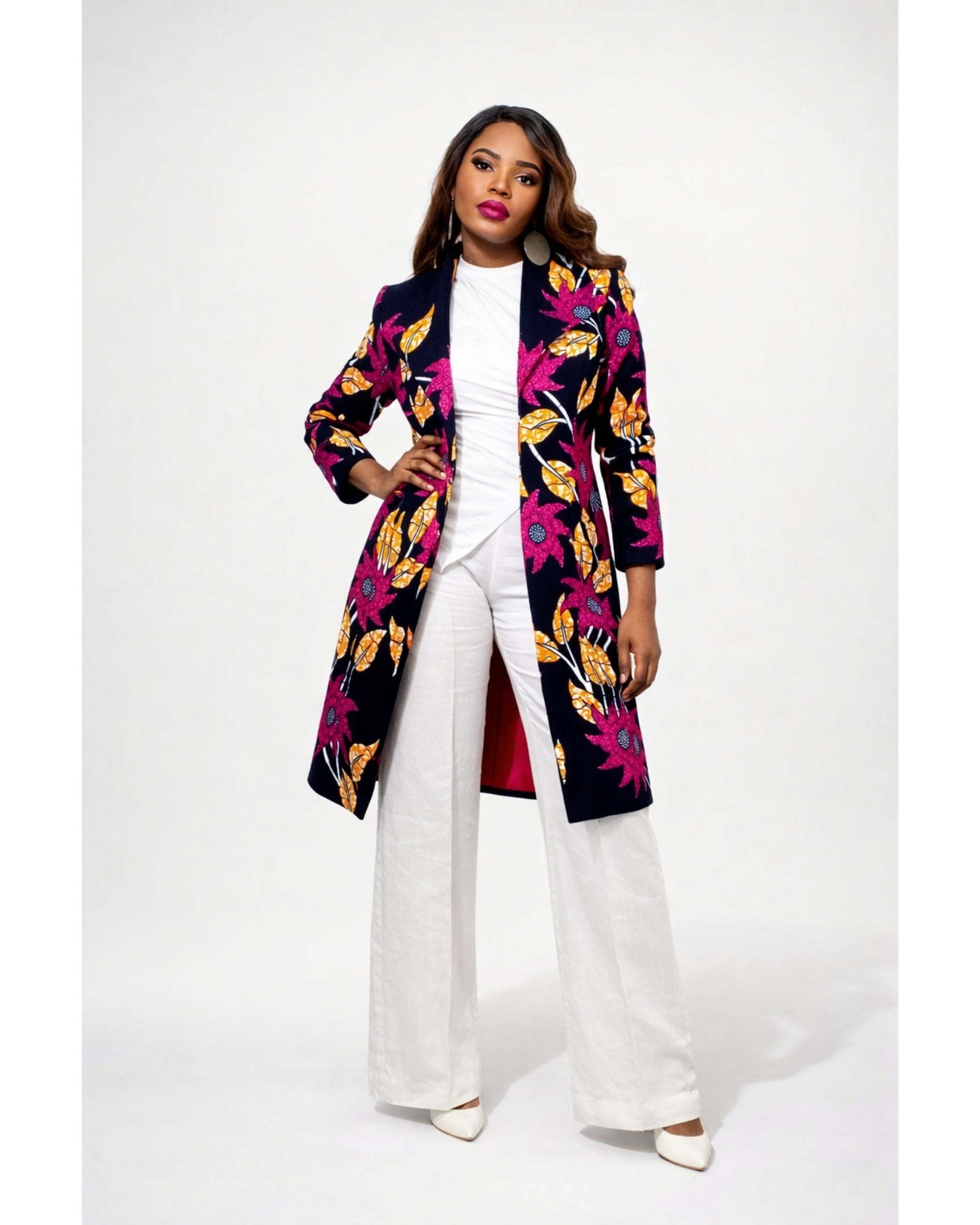 Bold floral coat featuring a flattering tie waist, tailored lapel collar, and vibrant pink flower print. Perfect for statement styling.
